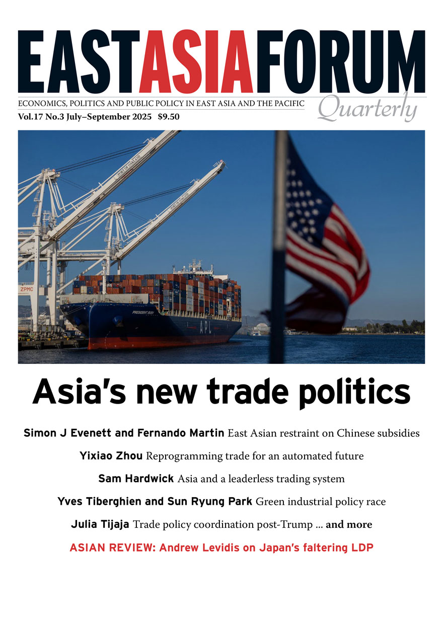 US protectionism is reshaping Asia’s trade politics. Rising tariffs and unpredictability from Washington are chilling investment, disrupting supply chains and driving governments towards transactional deals that corrode longstanding multilateral rules. This edition of East Asia Forum Quarterly maps the terrain on which Asia must choose between short-term accommodation and long-term growth and resilience. In an increasingly fragmented world, Asia’s best defence is to strengthen institutions to safeguard integration and hunker down behind the multilateral system—while preparing to take a leading role in rebuilding it.